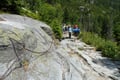 Auffahrt mit der Standseilbahn von Stary Smokovec. Von Hrebienok wandert man entlang der rot markierten Tatra-Magistrale zunächst zur Weggabelung Nad Rainerovou chatou kurz oberhalb der Staroles-nianska. Nun gerade aus weiter, kurz abwärts zum Bach Velky Studeny potok. An der darauffolgenden Weggabelung Pod Hupackami mündet von rechts der grün markierte Weg ein. Nun geht es auf einer Brücke über das kristallklare Gewässer und in einer Rechtskehre hinauf zum Obrovsy vodopad, wo man über ein weiteres Brücklein den Maly Studeny potok überquert. Über die untere Talstufe zieht nun der moderat ansteigende grün markierte, aber stark frequentierte Weg in einer Linkskehre hinauf in die Mala Studena dolina zur Zamkovskeho chata. Von hier führt unsere Route über den sogenannten Großen Lomnitzer Garten durch Latschen zum Fuße der Seewand. Ab hier steilt der Wegverlauf zunehmend an und leitet in Serpentinen über grobes Geröll und den Velky und Maly Hang hinauf in den Fünfseenkessel mit der Teryho chata. Nun folgt man der gelben Markierung am Prostredne Spisske pleso, dem zweitgrößten der Bergseen Spisske plesa, vorbei und weiter über den steilen Hang (Kettensicherungen) des kuppelförmigen Gipfel Pfinnova kopa aufwärts in den Hochkessel Kotlinka pod Sedielkom zu einer Weggabelung. Hier zweigt der grüne markierte Weg Richtung Sedielkom ab. Wir halten uns entlang der gelben Markierung rechts, steigen kurz in den Kesselboden hinab, bevor der anspruchsvolle finale Anstieg in den Prience sedlo (Prinzensattel) folgt. Sicherungsketten und Trittbügeln helfen im oberen Teil des An- und Abstiegs zum/vom Prinzensattel. Der weitere Abstieg ins Tal Velka Studena dolina weißt bis auf Geröll keinerlei größere Schwierigkeiten mehr auf. Unter den mächtigen Südwänden von Ostry und Javorovy stit, mit zwei kurzen Zwischenanstiegen und am See Prostredne Sive pleso vorbei, führt der Weg zum Bergsee Starolesnianske pleso mit Blick auf den imposanten Prostredny hrot und in wenigen Minuten weiter zur Zbojnicke chata (Räuberhütte).
