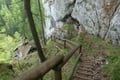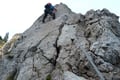 Vom Parkplatz folgt man dem markierten Wanderweg Nr. 740 in Richtung „Schüsserlbrunn“ über eine Wiese in den Wald hinein. Bei der beschilderten Abzweigung „Franz Scheikl-Klettersteig“ hält man sich links und verlässt den markierten Wanderweg. Zuerst quert der Weg einige Forststraßen und zieht daraufhin durch grasigen und felsdurchsetzten Wald bis zu einer alten Holzhütte empor. Bei der Hütte rechtshaltend erreicht man in wenigen Minuten über einen gut ausgetretenen und mit Steinmännern markierten Steig den Einstieg des Klettersteiges. Zu Beginn des „Franz-Scheikl-Klettersteigs“ geht es über ein Gratstück hinauf (A/B), an dessen Ende man Gehgelände erreicht und eine Schlucht quert. Daraufhin helfen einige Steigbügel über ein senkrechtes, zum Teil abdrängendes Steilstück (B/C) hinweg, bevor das Gelände neuerlich leichter (A/B) wird. In weiterer Folge führt der Routenverlauf über einige teilweise erdige Passagen und einen Gratverlauf mit abgelutschtem Fels (B) zu leichterem grasigem Gelände höher. Über einen leicht ausgesetzten Grat (B/C) erreicht man eine Schulter, an welcher sich das Steigbuch befindet Nun folgt eine kurze Querung (A/B) mit anschließendem kurzem Abstieg (B) zu der nächsten Rinne, welche im Gehgelände gequert wird. Erneut geht es aufwärts über einen kurzen, aber mit Trittbügeln entschärften Kamin (B/C) zum Gratverlauf. Dieser Grat (B) läuft nun zur finalen Schlüsselstelle aus. Hier hat man nun zwei Varianten zur Auswahl: leicht in der schuttigen Rinne (A) links neben der Grat hinauf zum Ausstieg, oder die spektakulärere Variante direkt über den ausgesetzten Grat. Dabei klettert man senkrecht, leicht abdrängend (C) hinauf auf den luftigen Grat. Im oberen Bereich wird der Gratverlauf etwas einfacher (B/C), bevor man daraufhin in eine Platte queren muss. Die beiden Trittklammern helfen erst, wenn man einen ganz kleinen Tritt und den sehr exponierten Spalt ausgenutzt hat (C). Nun wieder auf oder knapp neben der Kante (C) zum Scheitelpunkt, dann folgt die auslaufende Querung (B/C, dann B) zum Ausstieg des Klettersteigs. Um den geschmückten Gipfel des Hochlantsch zu erreichen, folgt man letztendlich linkshaltend den gut ersichtlichen Steigspuren durch die Latschengassen. Der Abstieg verläuft über den Westrücken zuerst entlang der Nordabstürze durch Latschen nach Süden und in weiterer Folge durch lichten Hochwald zum „Steirischen Jockl“. Von hier führen unzählige Holzstufen abwärts zum sehenswerten, in die Felswand gebauten Wallfahrtskircherl Schüsserlbrunn und weiter hinunter zum markierten Wanderweg Nr. 740, welcher uns zurück zum Ausgangspunkt bringt.