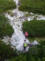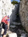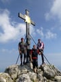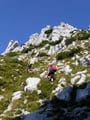Oben am von der "Bartlmahd" heraufziehenden Normalweg angekommen, konnte man diesem entweder weiter über das Reichenhaller Haus auf den Gipfel folgen, oder wie unsere Partie. Dabei wendet man sich nach ein paar Metern wiederum links vom Normalweg ab, folgt den erkennbaren Steigspuren an einem markanten Felsen vorbei und gerade hinauf zu einem Kamin. Diese knifflige, aber kurze Kletterstelle, die aber schlimmer aussieht als sie in Wirklichkeit ist, brachte uns eine Felsstufe höher. Nachdem eine kleine Felsbrücke sicher absolviert wurde, stiegen wir den Spuren folgend durch Schrofengelände weiter zum geschmückten Gipfel hinauf.