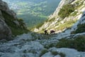 Allmählich lichtet sich der Hochwald und wandelte sich in steiles Schrofengelände. Über Schutt und leichte Schrofen führte der Steigverlauf jetzt ganz an die Wand heran und folgte dieser nach links weiter bergwärts. Schon bald erreichten wir 3 einen aussichtsreichen Rastplatz mit Gedenktafeln und dem Steigbuch. Die wunderbare Aussicht auf die umliegende Gipfelschau bzw. der famose Tiefblick auf Bad Reichenhall verleitete einfach zu einer kurzen Verschnaufpause, welche wir demnach in vollen Zügen genossen. So schön es auch war, es musste weitergehen! Nach dem „Rastplatzl“ zog der Steig im Wechsel zwischen leichten Kletterstellen und Gehgelände zu einer breiten Rinne empor, die es schlussendlich in leichter Kletterei teils durch Latschengebüsch in der Direttissima durchstiegen werden musste. Es handelte sich hier zweifelsohne um einen hochalpinen Steig, der Trittsicherheit und Schwindelfreiheit UNBEDINGT voraussetzte. Vor allem im oberen Teilstück mussten die Hände des Öfteren zu Hilfe genommen werden, da es Kletterstellen im Bereich bis zu UIAA II zu überwinden gab.