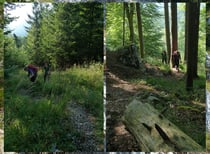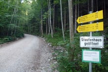 Vom Parkplatz Padinger Alm verfolgten wir anfangs den "Stonanen Jager"-Steig nach Osten. Der dort am Weg befindliche Einstieg des kartografisch nicht mehr erfassten Goldtropfsteiges ist im Regelfall nicht ganz einfach zu finden, doch Dank unseres GPS-Gerätes und einem Track war es für uns hingegen eine spielerische Leichtigkeit. Deutlich erkennbare Steigspuren leiteten von der Schotterstraße nach links ins Gebüsch hinein und lotsten unser 3er-Team im Anschluss daran über einen stark verwachsenen Kahlschlag zum Hochwaldrand hinauf. Rasch an Höhe gewinnend ging es nun Kehre um Kehre im Schatten der Bäume höher. Manchmal verlor sich zwar der Steig kurzfristig etwas, doch die aufgebauten Steinmandln gaben bei der Wegfindung gute Hilfestellung.