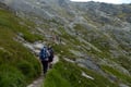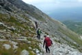Vom Parkplatz folgt man zuerst der oberhalb der Straße befindlichen rot/grün markierten Tatra-Magistrale zur Weggabelung beim alten Forsthaus Tri studnicky. Nun wendet man sich der grünen Markierung zu, biegt rechts ab und wandert in Richtung Nordosten bergwärts. Schon bald steilt der Wegverlauf zunehmend an und zieht darauffolgend in Serpentinen bis unter die markante Anhöhe des Grunik hinauf. Es geht weiter steil bergauf. In einer langen Aufstiegsquerung passiert man die noch höhere Kote im SW-Ausläufer des Krivans, die Vysna Priehyba (1982m), und betritt die mächtige, vom Krivan herabziehende Schuttrinne Krivansky zlab. Nach etwa 2,5 Std. gelangt man in die Falllinie des markanten Sattela Daxnerovo sedle am südlichen Kamm der Gipfelpyramide. Von rechts mündet hier der blau markierte Pfad in die Route ein und die grünen Markierungen enden. Der alte Weg folgt der Sattel-Falllinie direkt nach oben. Wegen des instabilen Schutts wurden die Markierungen neu angebracht und leiten nun etwas weiter rechts durch festes und verlässliches Felsgelände. Man steigt auf der Kante des südlichen Kammes weiter, wendet sich nach links und erreicht auf der Kammlinie zunächst den Vorgipfel Maly Krivan (2334m). Erst nach dem Maly Krivan erreicht man den Daxnerovo sedlo (2325m), welcher genaugenommen aus drei einzelnen Vertiefungen besteht. Nun trennen Einem nur noch 30 Minuten vom Top. Es geht zunächst entlang des Kammes, dann links hinunter und im Anschluss in leichter Kletterei durch die steile, felsige Flanke hinauf zum geschmückten Gipfel. Auf gleichem Weg steigt man zunächst bis zur Weggabelung mit den grünen Markierungen bergab. Ab hier verfolgt man nun den blau markierten Pfad unterhalb des südlichen Kammes im einem weiten, stets abfallenden Bogen und gelangt über den etwas eintönigen, langgestreckten Rücken Pavlov chrbat und durch die darauffolgenden Latschengassen die Tatra-Magistrale beim See Jamske pleso. Von hier geht es auf der Magistrale zuerst in östliche, dann in südöstliche Richtung, vorbei an der Weggabelung im Tal Furkotska dolina bis nach Strbske Pleso.